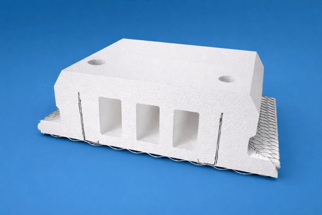 Il sistema viene integrato all’interno del progetto strutturale come solaio a travetti in cemento armato, con il vantaggio di combinare funzione portante e isolamento in un’unica soluzione.